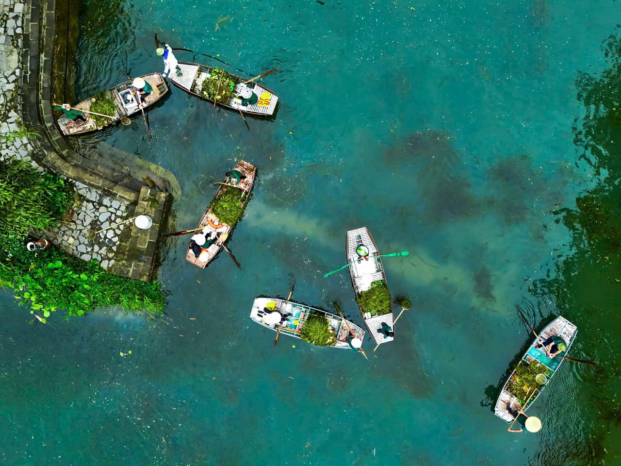 13h00: Visit Tam Coc by1.5-hourbamboo boat. You will be surprised by the charming beauty here with paddy fields, river, water, cloud, sky, and a stunning cave system during the boat trip. All make a masterpiece that the Vietnamese people called “Ha Long Bay on land”